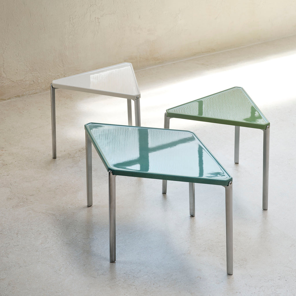 Materials: frame in polished die-cast aluminium and in powder coated aluminium (for outdoor version). Concrete top liquid painted glossy finish.